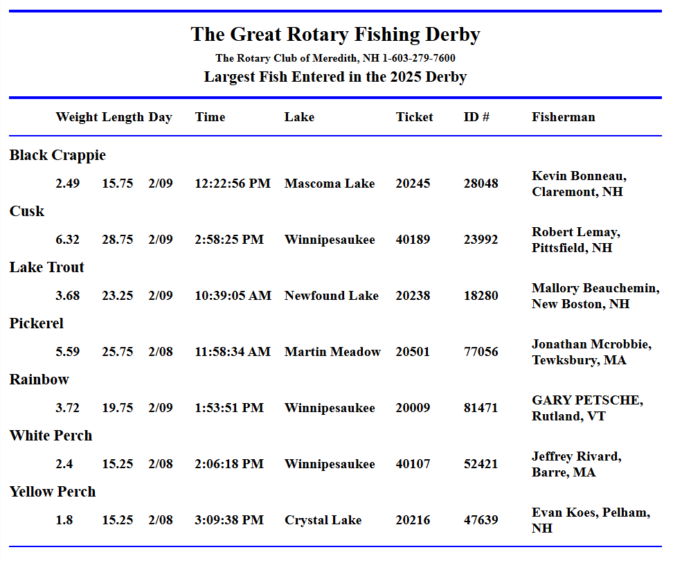 Do you have a question about the Great Meredith Rotary Fishing Derby? What do you need to know? These are some of the questions we’ve received recently.